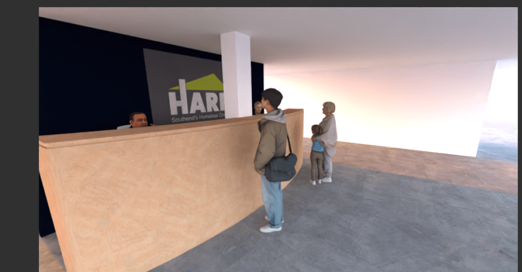 Just after 1 p.m., I was invited to join a site visit to a new project they’re developing for HARP, a local charity. They’ve acquired a building on the High Street with plans to turn it into a restaurant-bar-style community hub, with medical services, dental care, and spaces for encouragement, support, and activity. Walking through the building, I was asked to assess which works had been completed and what phases were still to come. I also took measurements for a proposed reception desk—another live project I was given to model.