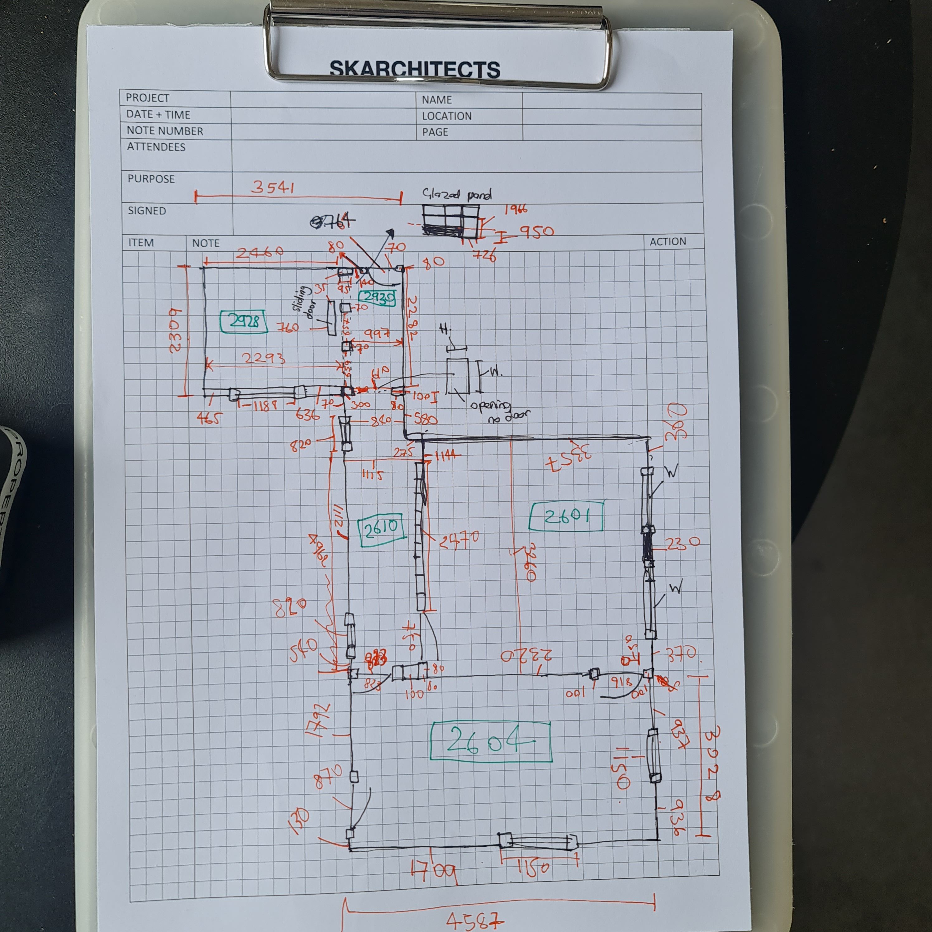 I sketched the rooms as I went, marking measurements on the drawing. Will showed me how to separate the ceiling heights into a box in the middle of the page, while hallway dimensions were marked in green pen and room measurements in red, keeping it clear and organised.