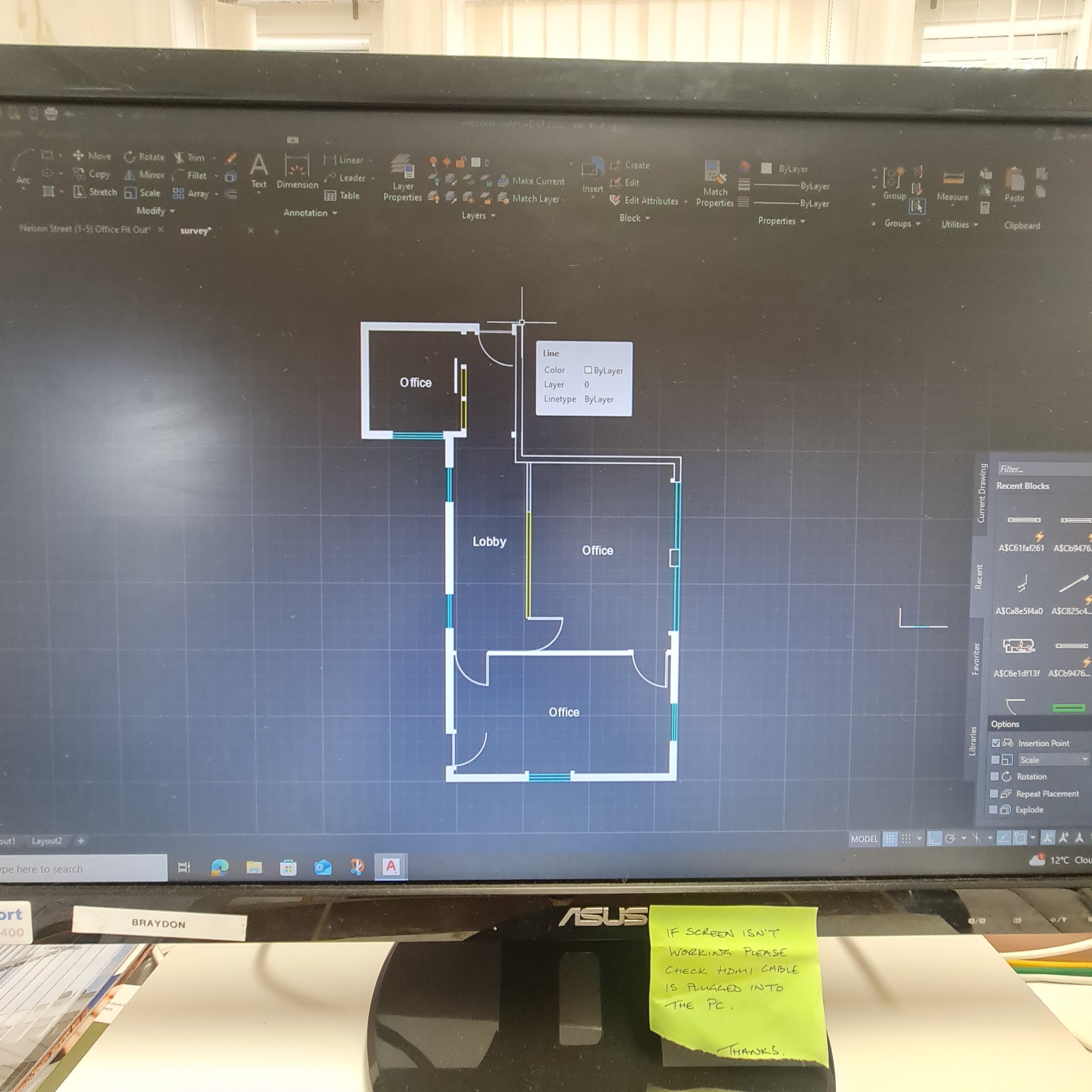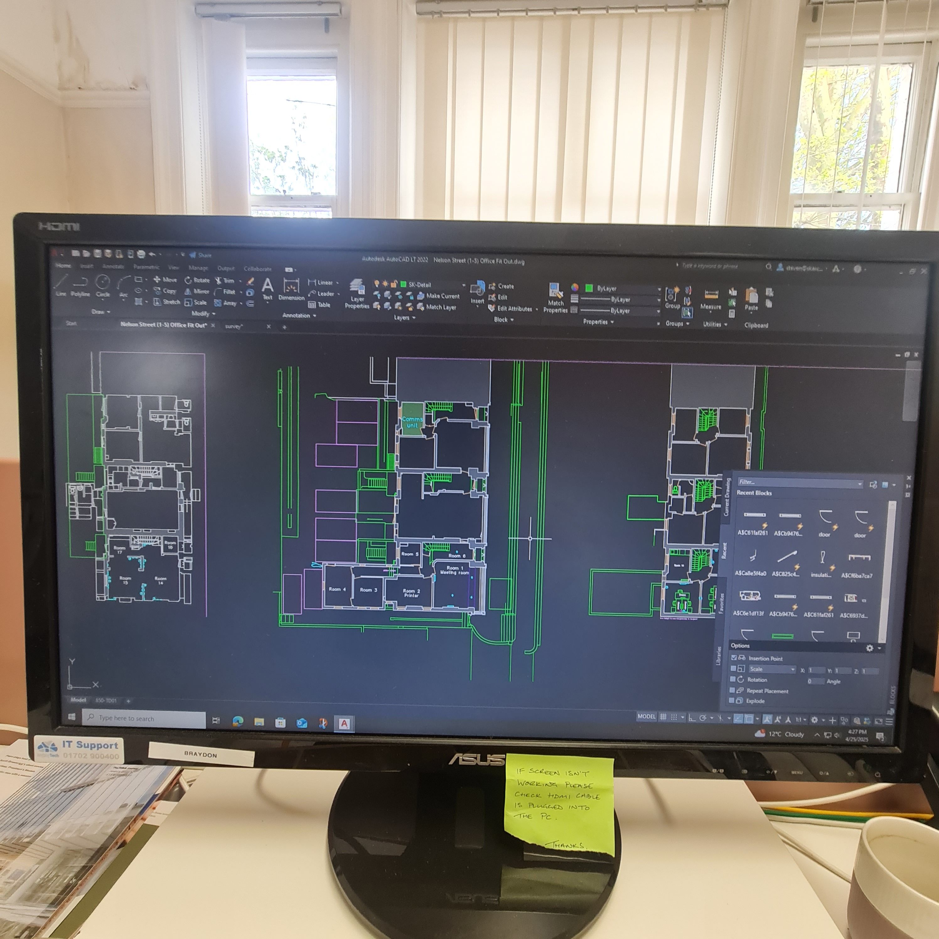 After the measuring stage, I started transferring everything into CAD. Will showed me some shortcuts — how to repeat elements, how to scale walls easily, and generally how to work faster and more efficiently. As I plotted, I realised a few of my measurements were slightly off, but it was easy enough to pop back downstairs, double-check, and adjust. Sometimes it was out by 20–40mm, sometimes a little more, but overall Will said I’d done a really great job, especially for my first time surveying and plotting out an entire space.