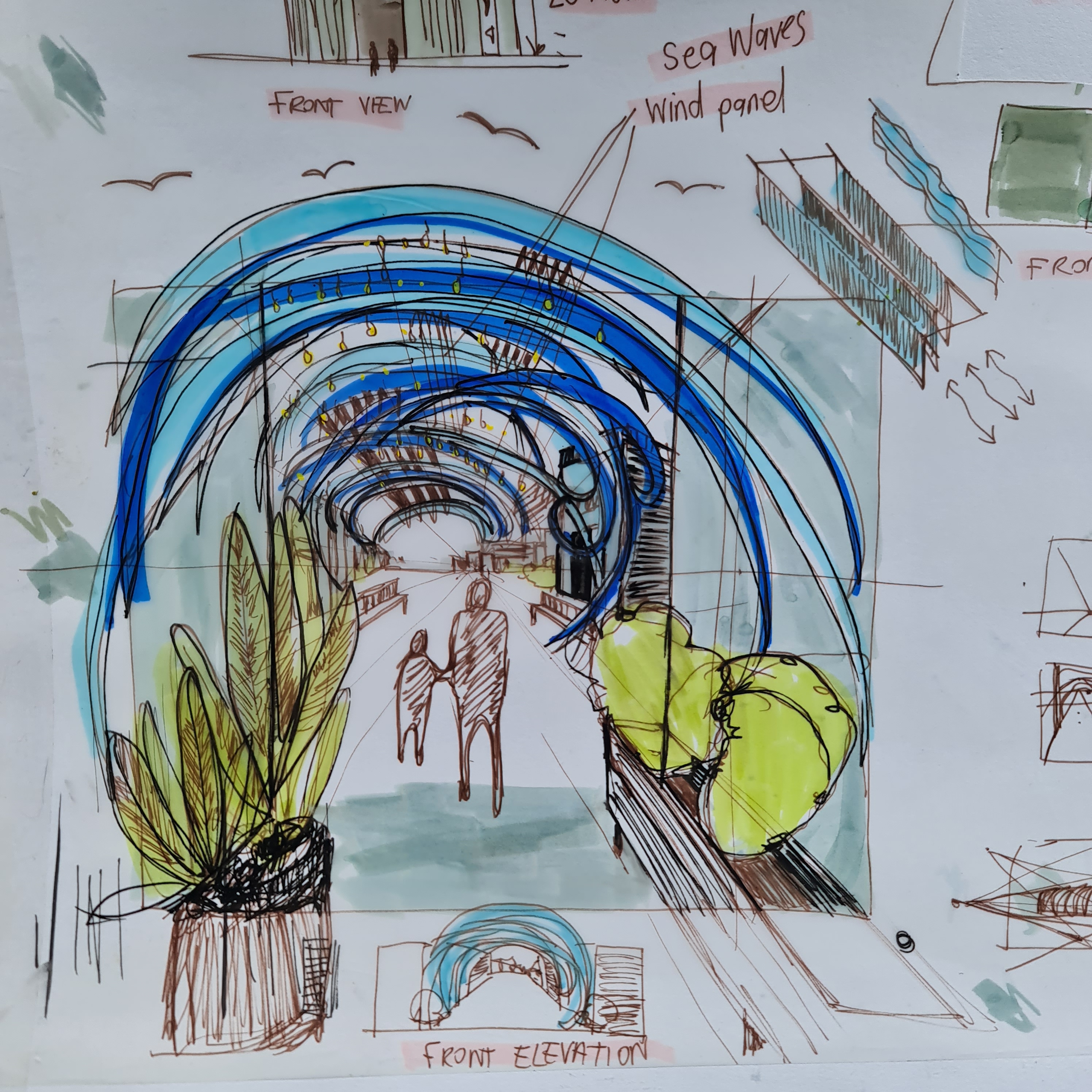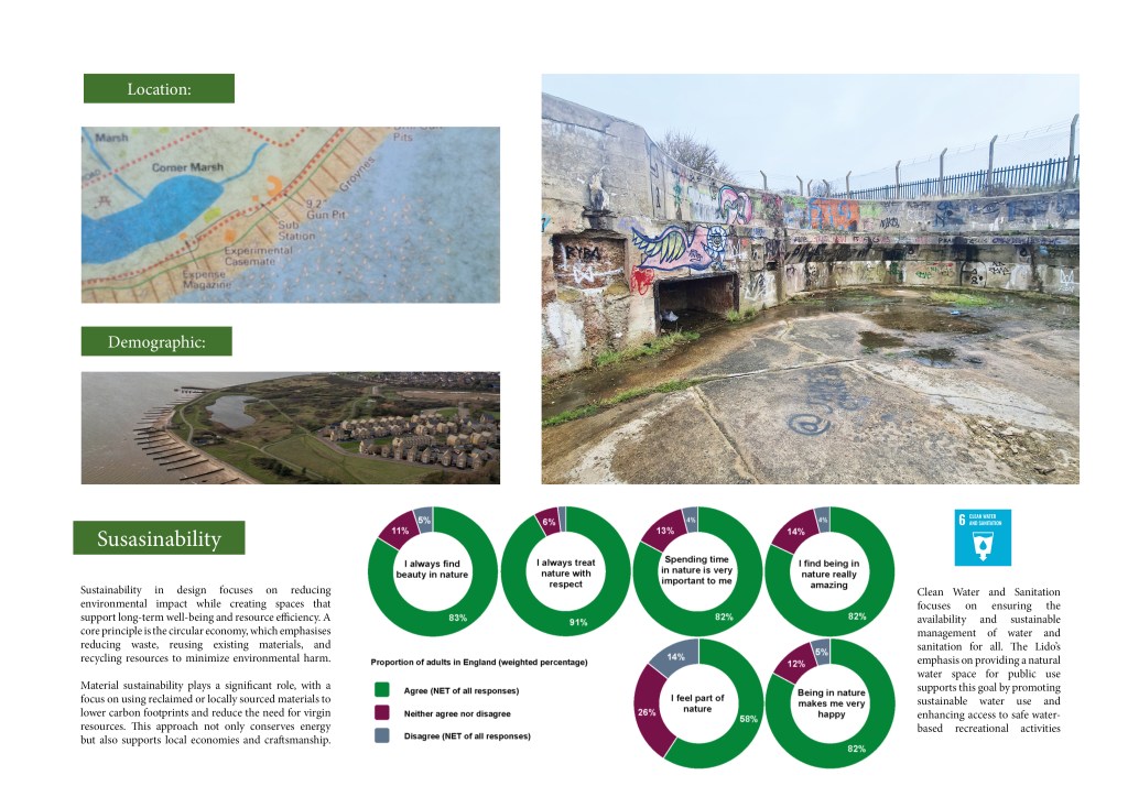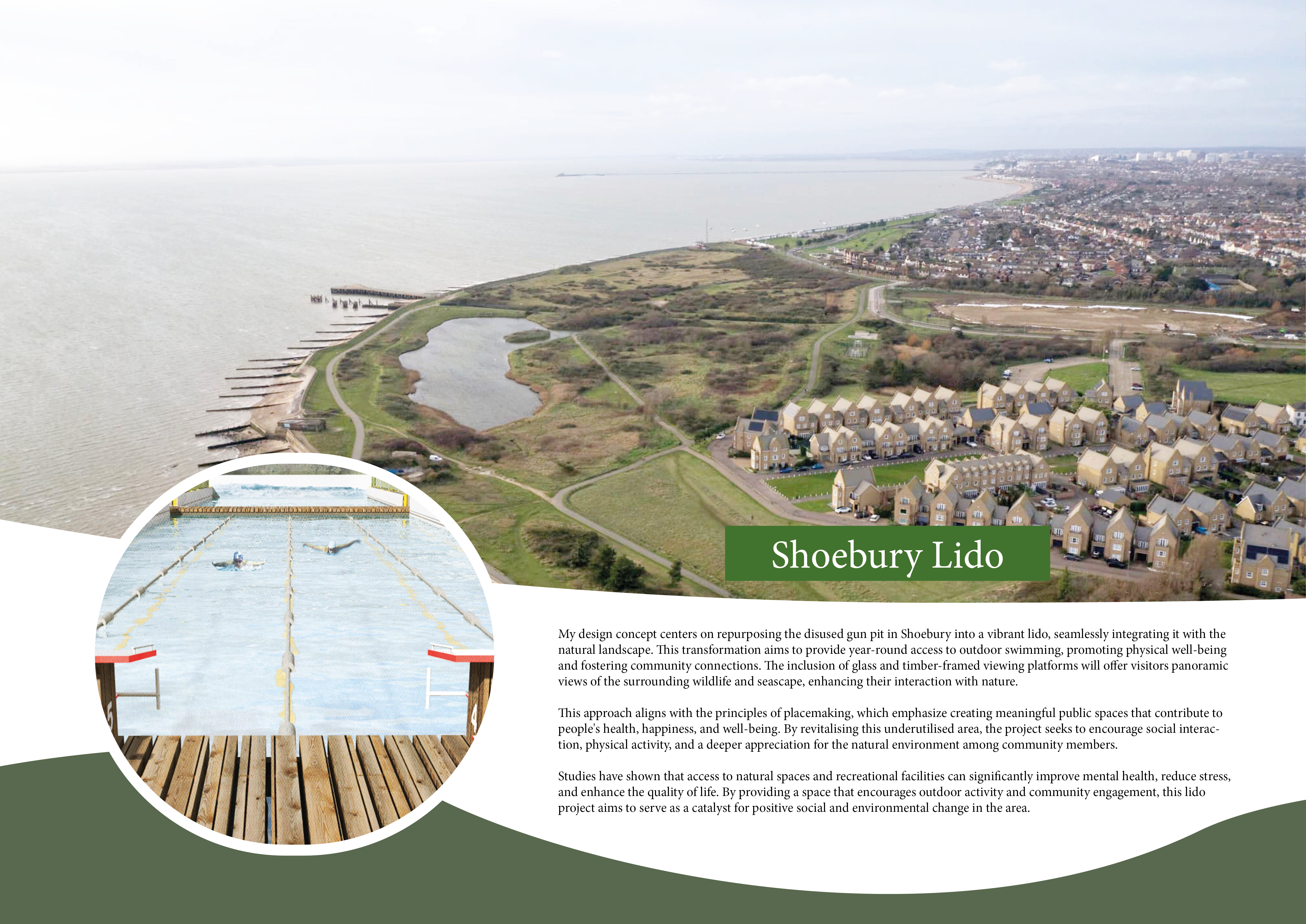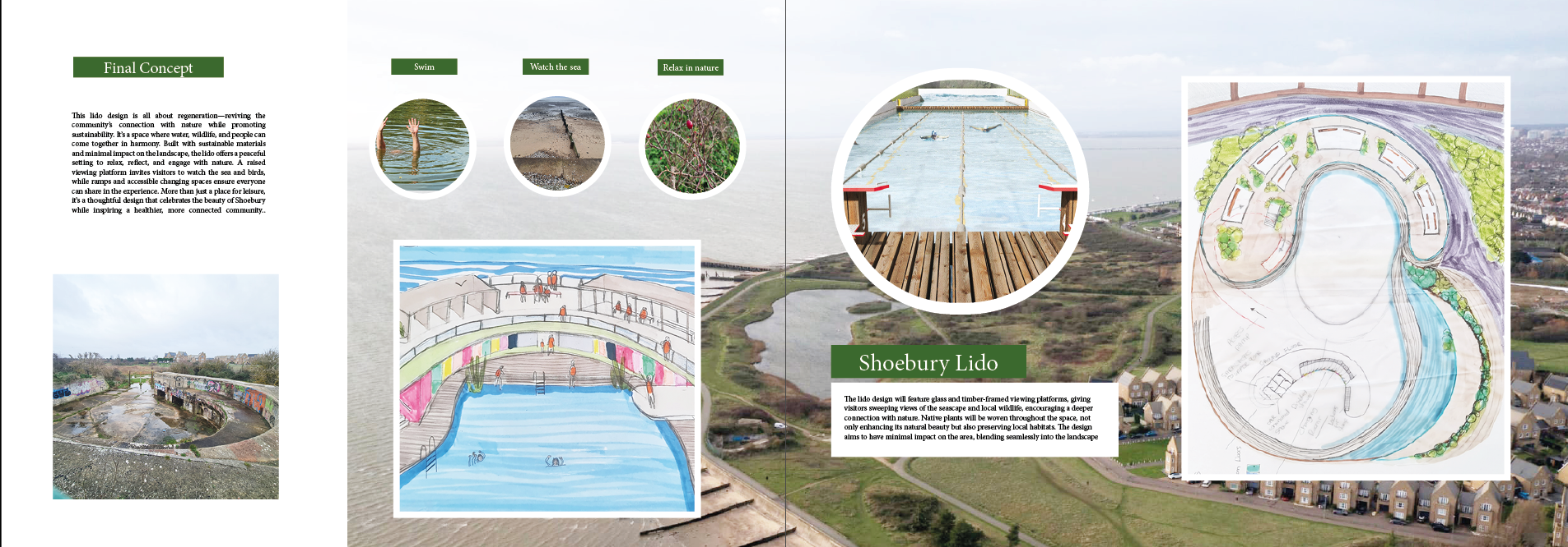 Lido – Reclaiming Water, Reviving Community For this project, we were tasked with redefining an urban space and breathing new life into something forgotten. I chose to reimagine Southend’s relationship with water not merely as a backdrop but as a living immersive part of the city itself. The result was Lido, a vision for a modern revitalized open air swimming area where the sea and the urban landscape merged in a way that felt both natural and essential. This project was not just about bringing back a lido; it was about restoring a sense of ritual and play, creating a communal meeting point shaped by water and movement. Inspired by the fluidity of the tide, the design incorporated curved organic pools, sun warmed seating terraces, and tidal walkways, crafting a space that felt as though it had always been there waiting to be rediscovered. More than just a place to swim, Lido was envisioned as a space for connection a reminder that water is not merely to be observed but truly experienced.