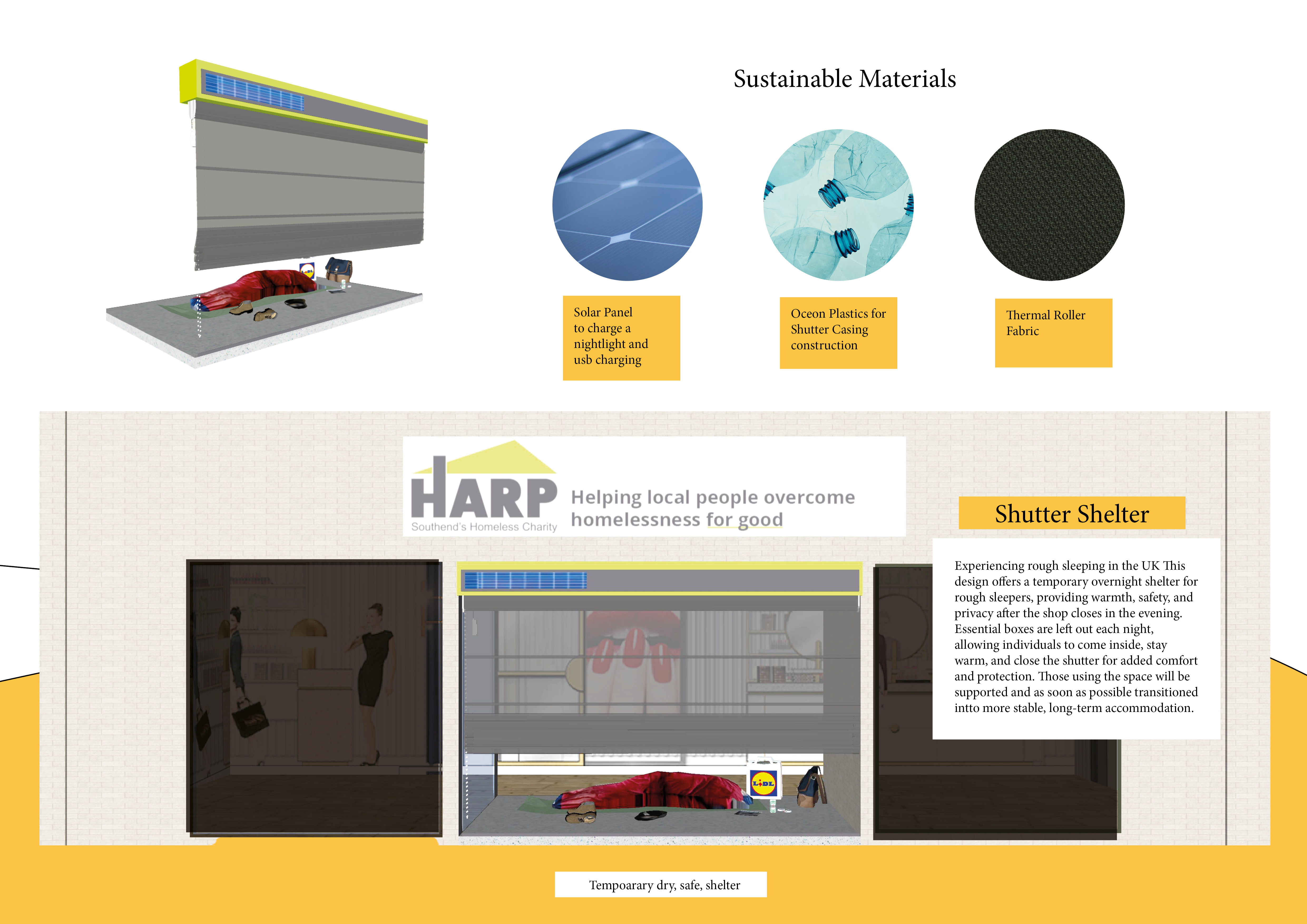 This project addressed a pressing issue: Southend High Street is lined with empty shopfronts, while many individuals sleep exposed, with no place to go. The challenge was to find a way to provide shelter within the existing urban landscape, creating something practical, humane, and truly necessary. Shop Shelter transformed shop doorways, which are already used by rough sleepers as makeshift refuges, into retractable and thermally insulated enclosures that offer privacy, protection, and dignity. Made from recycled materials, these shelters come equipped with solar powered phone charging and are designed for easy deployment. They aim not just for survival but also to rethink how cities engage with homelessness. This initiative is more than a temporary solution; it represents design as care, demonstrating that public spaces can be reimagined and that no one should feel invisible in the place they call home.