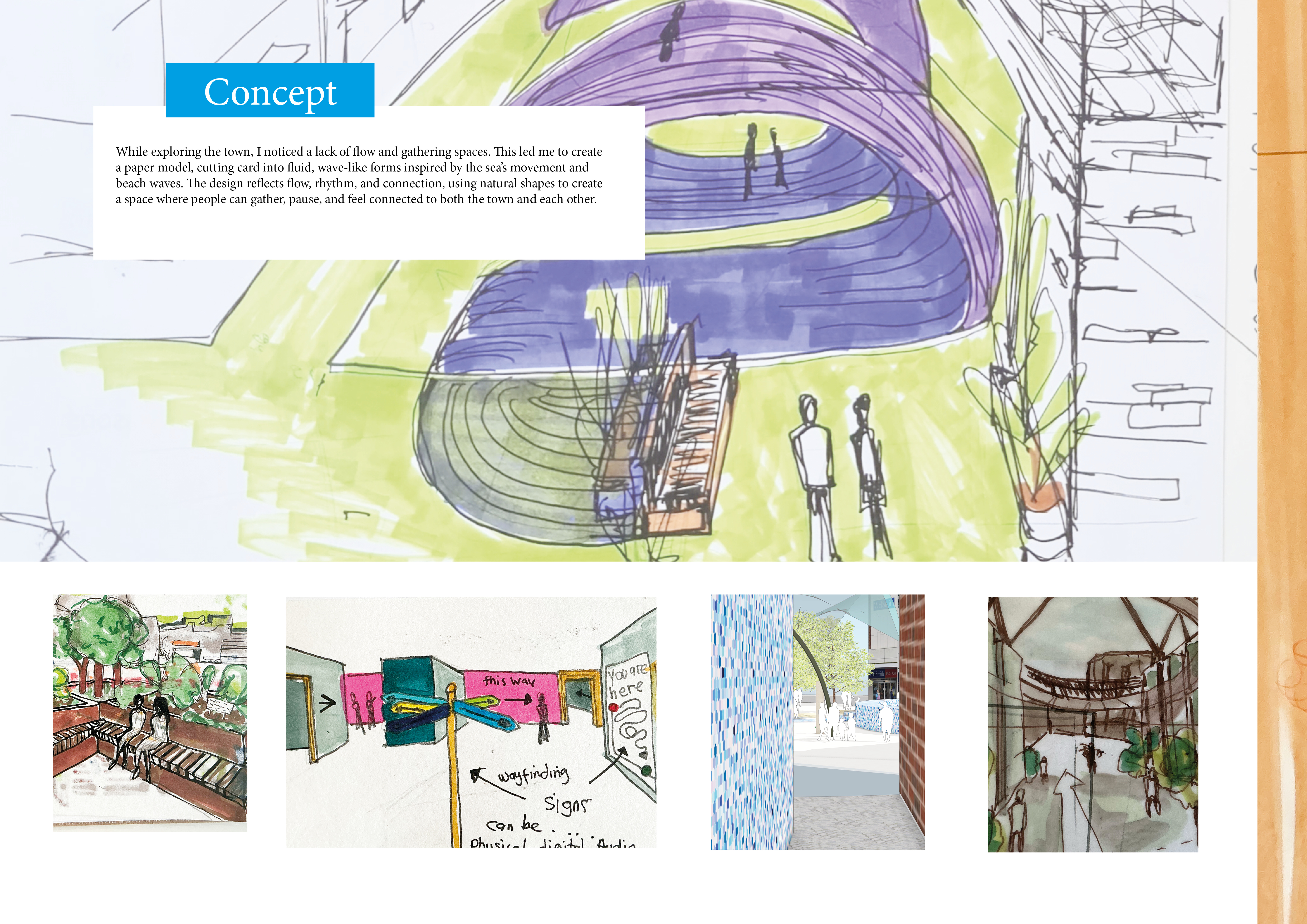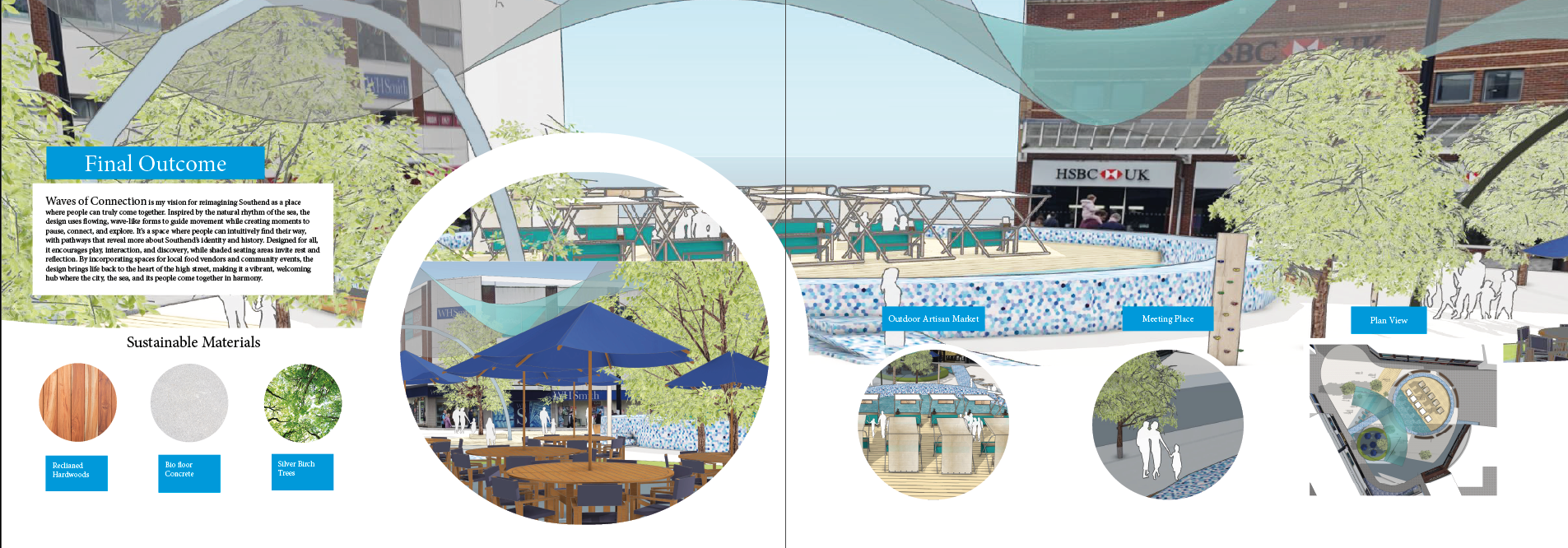 For this project, we were challenged to reimagine Southend High Street—to transform a space that had lost its identity into something that felt alive again. I wanted to design an intervention that didn’t just fill empty space but instead restored movement, connection, and rhythm to the street, inspired by the very thing that defines Southend: the sea.